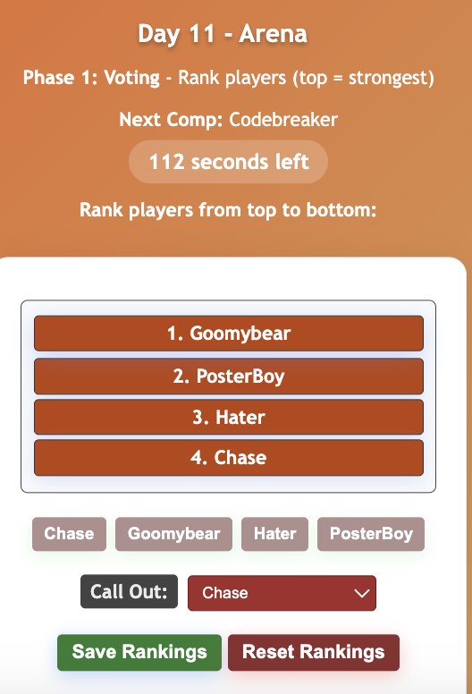 Rain saved ChaseChase saved HaterHater saved PosterBoyPosterBoy saved GoomybearFrostbite has been nominated and called out Chase to join them in the arena.