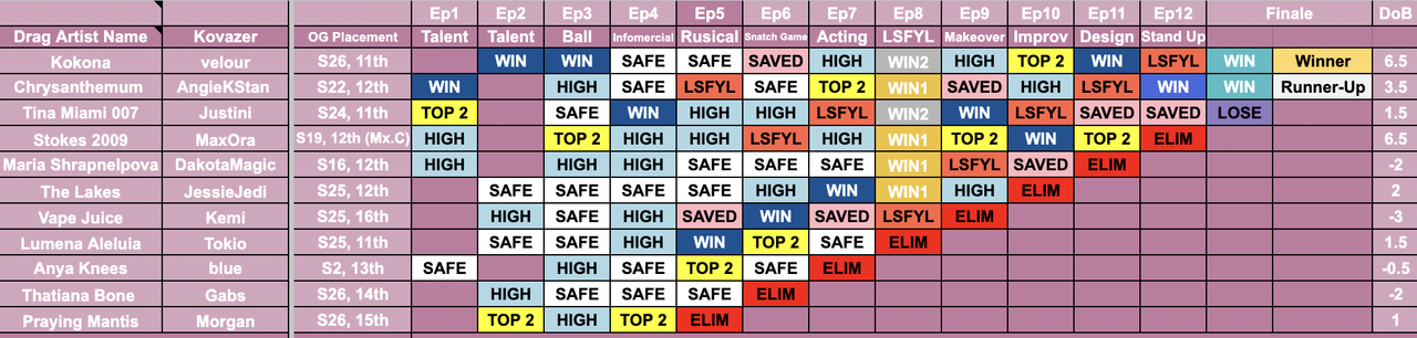 MacKenzie's Drag Race Season 28 Results