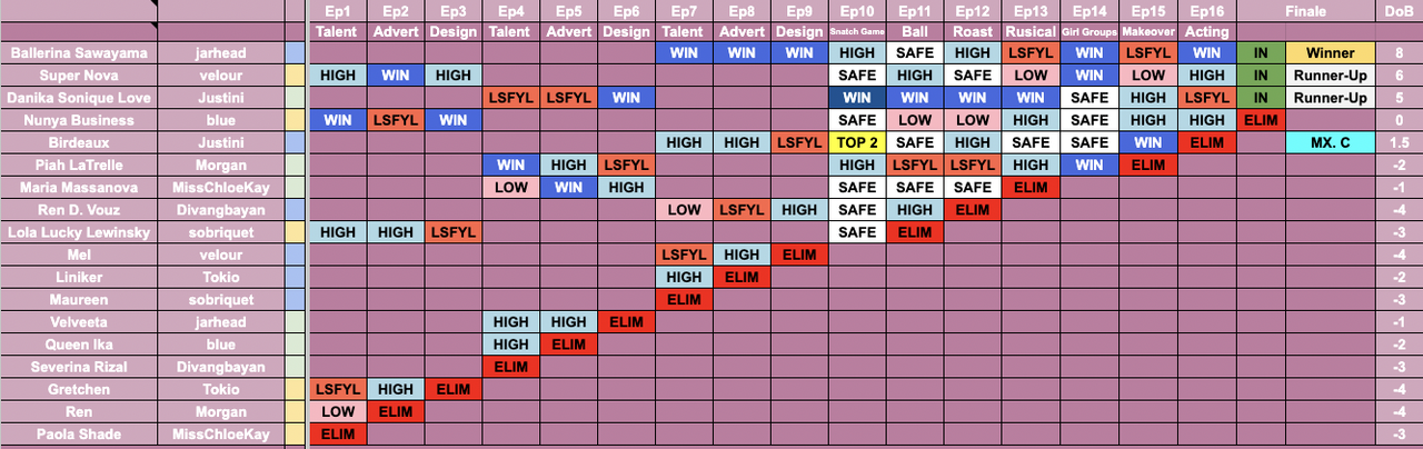 Also congrats to our Mx. Congeniality, Birdeaux Justini! Birdeaux snatched one win right before their elimination in 5th, but was in the top a lot prior to that.