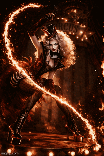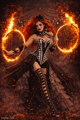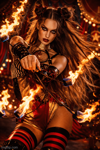 In this photoshoot, you will see a model transformed into a fierce circus performer who plays with fire with confidence and control. Through strong eye contact, powerful poses, and a commanding presence, she turns danger into beauty and flames into high fashion. This shoot is all about power, passion, and seduction.