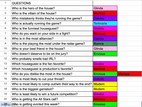 At the TOUCHY SUBJECTS HOH competition, Glinda surprised herself and her houseguests by coming in 2nd place! Ultimately it was Kodua who rose to power, winning her second competition of the summer. Prior to the competition, the houseguests were informed that the HOH would only make ONE initial nominee. Marissa shocked the house at her key ceremony and declared to Dakota and Torimarie that she was onto them.